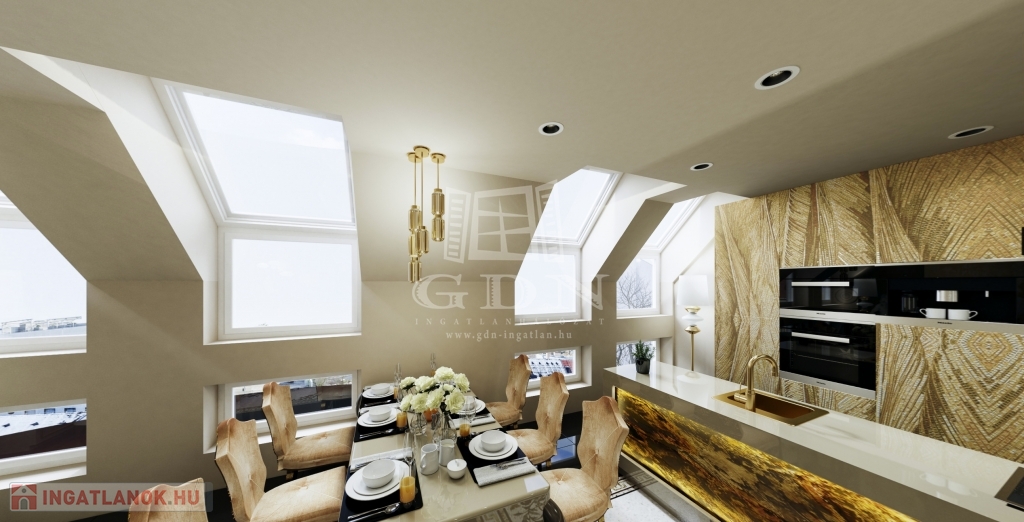 V. kerület Belvárosi részén, napfényes, magasemeleti luxus lakások kerülnek kialakításra a kivitelezéssel párhuzamosan pedig az épület korhűen megújul és egyidejűleg modern felvonó kerül beépítésre. Összesen 174m2 lakóterülettel rendelkezik ez a remek három hálószobás, tetőteraszos ingatlan. A bejárati szinten a konyha nappali mellett egy vizes helyiség kerül kialkaításra, a hálószobák az élettértől jól elszeparálva az emeleten kapnak helyet a mellékhelyiségekkel, innen jutunk fel a privát 28m2-es tetőteraszra mely kizárólag ennek a lakásnak a kényemét biztosítja. Az előrelátó tervezésnek köszönhetően nem lakószobából megközelíthető a tetőterasz így valóban szerves része lehet a lakásnak. Méretéből adódoan akár egy családnak megfelelő lakóhelyet biztosíthat. A mellékelt látványtervek csupán egy, a számtalan megvalósítható lehetőség közül, jelen stádiumban még 100%-ban lehetséges a leendő tulajdonosok elképzeléseinek megvalósítása.