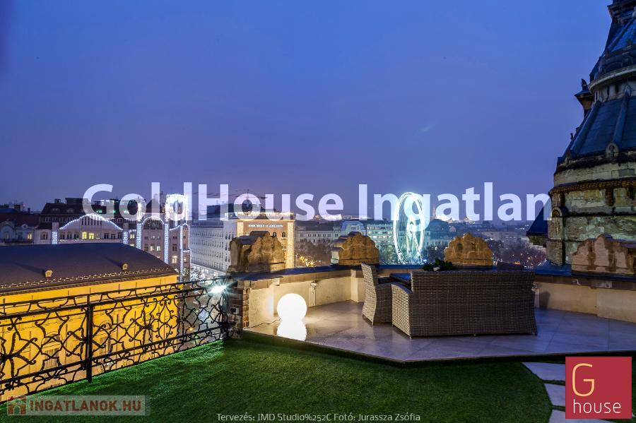 A luxuriour beautifully renovated (2021) and completely furnished 2 bedroom apartment is for long-term rent and for sale in the very heart of Budapest. The spacious and airy apartment consists of a large and sunny living room with dining area, fully equipped kitchen, 1 bedroom resp. study with access to the terrace, 1 bedroom resp. study with cloakroom, 1 bath with bath-tub, shower, and toilet, 1 seperate toilet, 1 large roof terrace (74 m²) with stunning views over the roofs of central Budapest and a room accessible from the terrace with a shower and space for the storage of patio furniture.