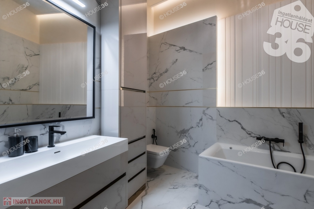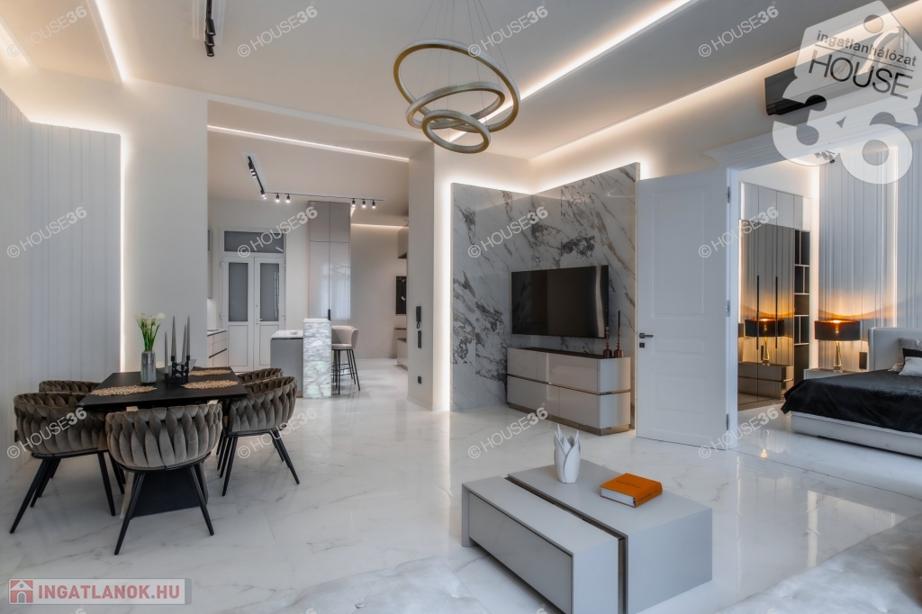 Neves tervezőiroda által megálmodott és egyedileg kivitelezett értékálló polgári lakás. Egyedileg tervezett bútorok, minőségi hidegburkolatok, led fény világítások mellett különleges Onyx kőből épitett bárpult is található.