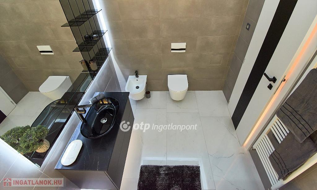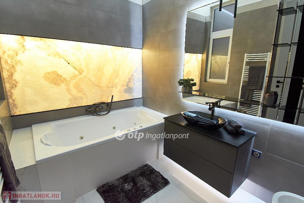 Felszereltség: - 3 rétegű üvegezés a 6 kamrás műanyag nyílászárókon (0,7K), - Motoros alumínium redőnyök, - Padló -és falfűtés Kondenzációs kazánnal, - Hűtő-fűtő klímarendszer Minden szobában, - Gépesített konyha, - Riasztó, Safe, - Ledes fő-és hangulatvilágítás rendszer, - Stand by kapcsoló rendszer, - HD Projektor, motoros vászon (12 nm) , -5.1.-es házimozi rendszer, Beépített Hangfalak, - Szauna, - Masszázs kád, - Teljes falfelület dryvit hálózva a repedések elkerülése érdekében, - Teljes falfelület tapétázva, - Teljes hangszigeteltség Blue Aqusto és Üveggyapottal, - Egyedileg gyártott fa ajtók, bútorok.