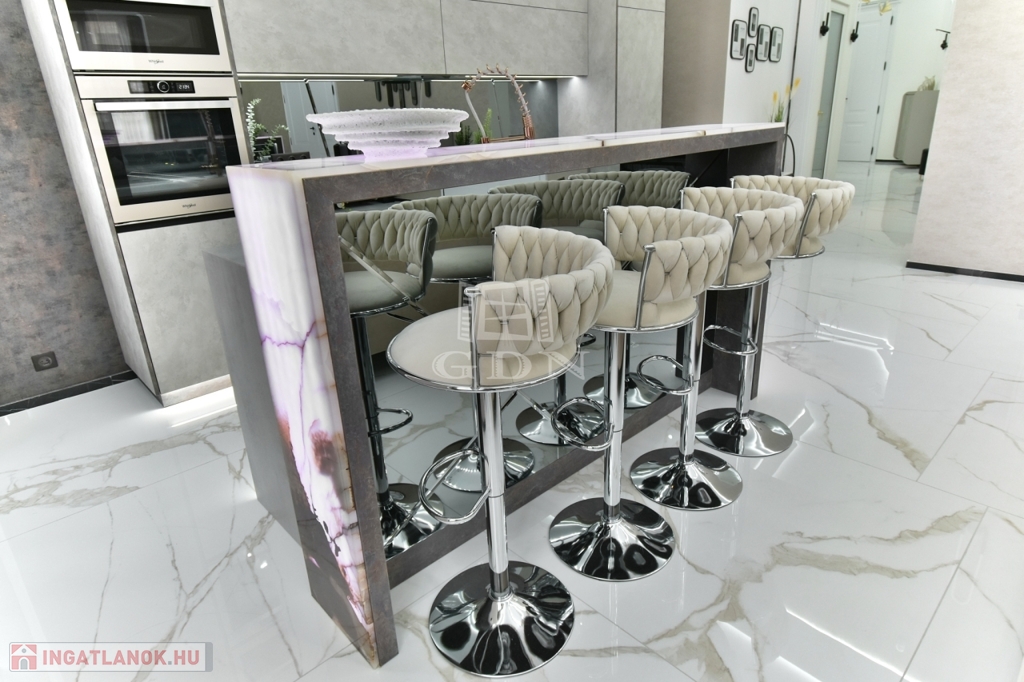 Az ingatlan igényesen berendezve, új, egyedileg gyártott minőségi bútorokkal, garanciális gépekkel, extrákkal (hangszigetelés, házimozi, projektor, vetítővászon, eredeti onyx bárpult, egyedi fénytechnika, automata redőnyök) felszerelve várja új tulajdonosát.