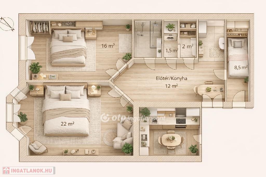 2 külön nyíló szoba + tágas nappali, konyha étkezővel, fürdőszoba külön toalettel.