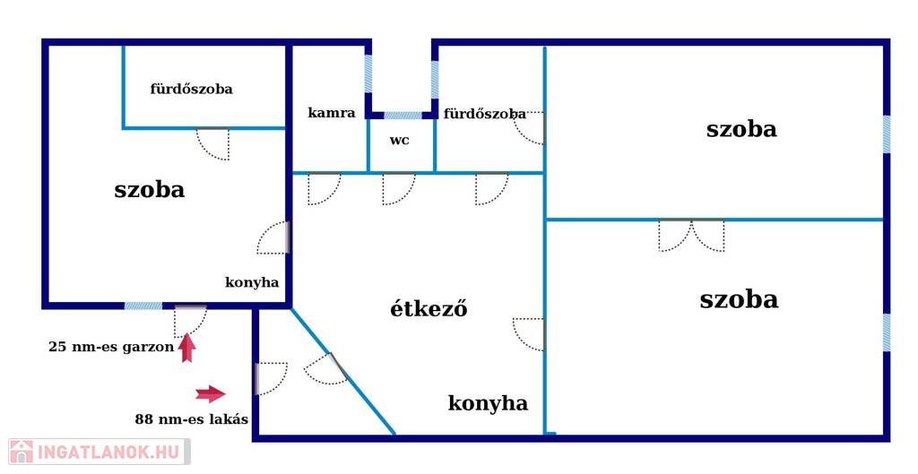 Az ingatlan 113 nm-es amely jelenleg 2 bejárattal rendelkezik, de a két lakás között az átjárás jelenleg is biztosított.