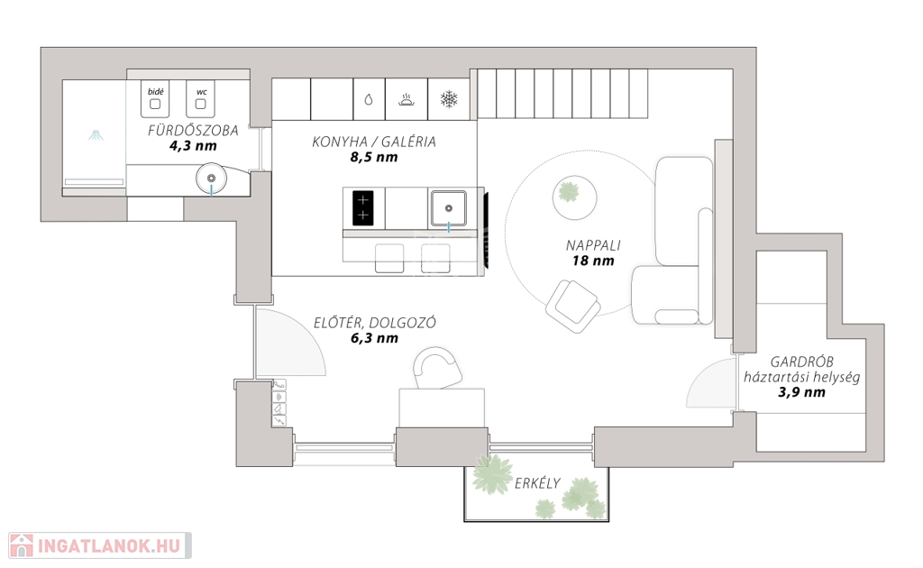 Az 1. emeleti, 41 m²-es lakás praktikus elrendezésű, amelyhez 8 m²-es galéria és egy 2 m²-es terasz is tartozik. Az ablakok és a terasz a gondosan megújított belső udvarra néznek, így a belvárosi elhelyezkedés ellenére csendes, nyugodt életteret biztosítanak.