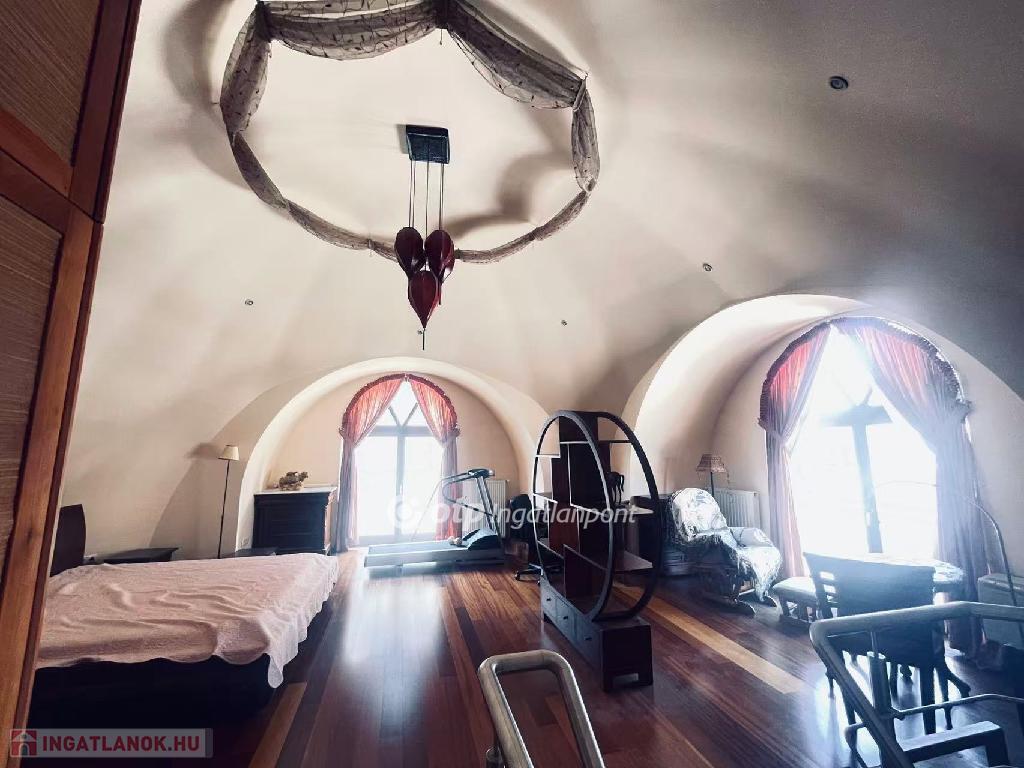 Az elegáns, tömör fából készült lépcső egy rendkívül tágas hálóhelyiséghez vezet az emeleten, mely igény esetén két különálló hálószobává is alakítható. Ezen a szinten található egy nagy méretű, beépített sarokgardrób is, mely praktikus tárolási lehetőséget biztosít.