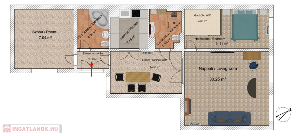 - Fűtés: fan-coil légfűtés, klímával kombinálva