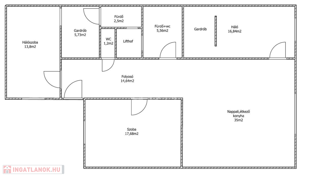 Elrendezés: nappali + 3 külön nyíló szoba