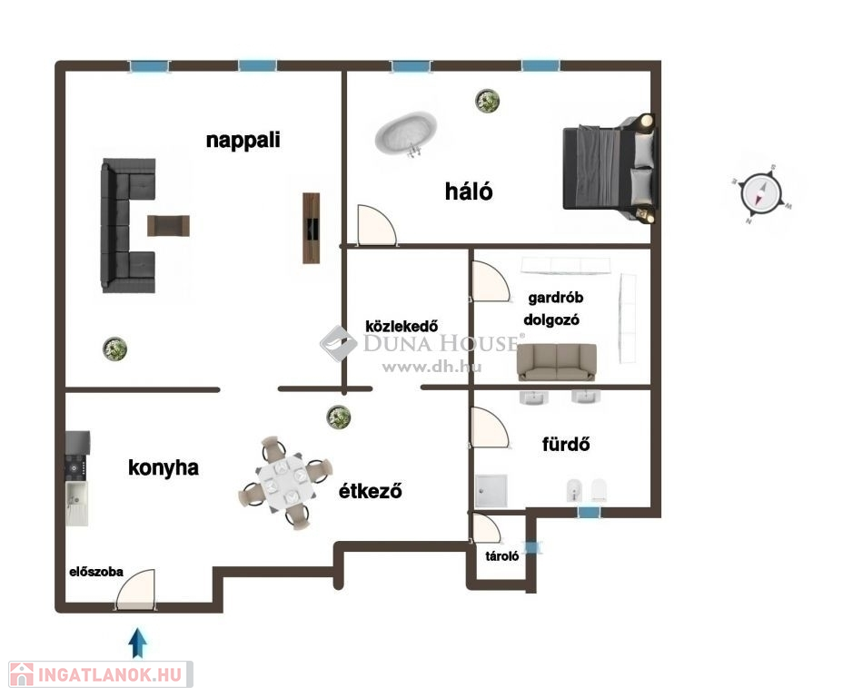 - Nappali + 1 szoba, gardrób vagy dolgozószoba, konyha + étkező, fürdőszoba+ wc