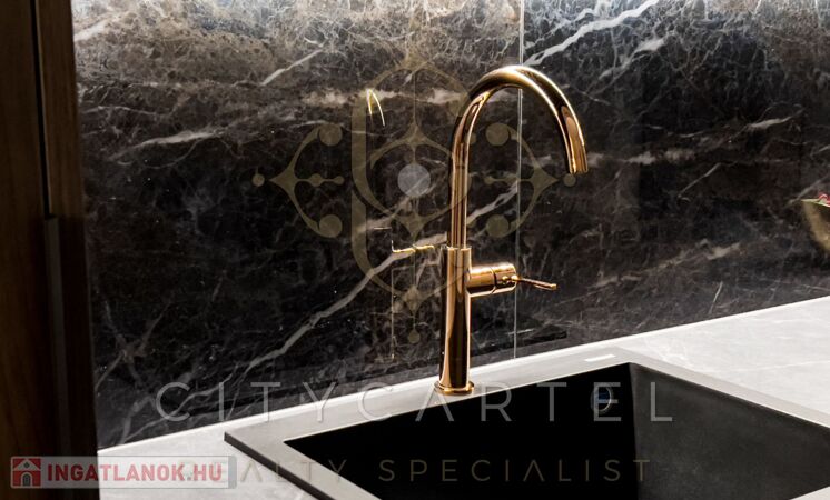 A lakás egyik különlegessége a tágas konyha, ahol konyhasziget kapott helyet, benne beépített borhűtővel, ami igazi kényelmi pluszt nyújt a mindennapokban. Emellett található egy külön kis háztartási helyiség, ahol a mosógép és a szárítógép került elhelyezésre – praktikus, zajtól elszeparált megoldás.