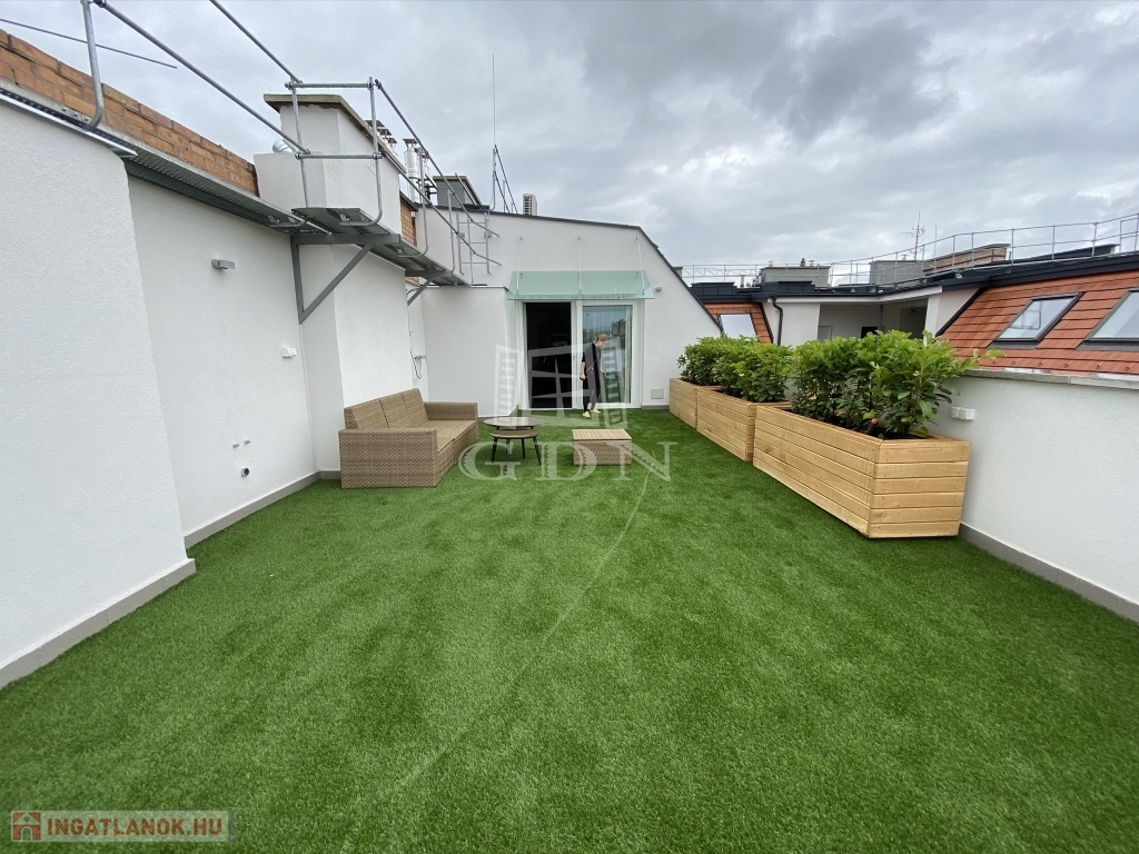 Nagymező utca közelében ajánljuk figyelmébe ezt az új építésű dupla komfortos, két hálószobás, nagy teraszos lakást. Az épület a beépítéssel párhuzamosan teljesen megújult, a lakás az ötödik emeleten található , a két hálószoba mellett két fürdőszoba került kialakításra. A lakás különlegessége a nappaliból nyíló 66m2-es terasz mely tavasztó őszig egy plusz szobát jelent. A lakás fűtése padlófűtés és gázkazán kombinációval lett megoldva mely a melegvizet is biztosítja.A hűtés split klímákkal megoldott, a konyha gépesített. A lakás jelenleg hosszú távra van bérbe adva 4,6% fizet évente a bérlő. Az elhelyezkedésének köszönhetően akár vagy rövidtávú bérbeadásra is tökéletes lehet.