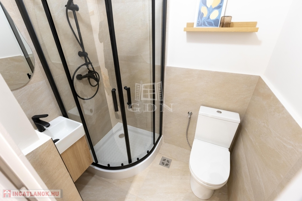 A lakás vadonatúj állapotú – a vezetékektől a burkolatokig mindent kicseréltek, modern konyhával és elegáns fürdőszobával látták el. A galériás kialakításnak köszönhetően tágasabb érzetet kelt, a felső szinten kényelmes hálórész kapott helyet. Az enteriőr letisztult, mégis karakteres, a belső tér harmóniáját a gondosan megválasztott színek és anyagok biztosítják.