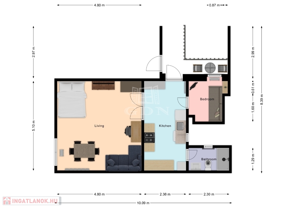 Az ingatlan 44 négyzetméteres, ideális választás egyedülállóknak vagy fiatal pároknak.