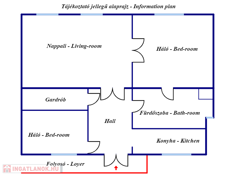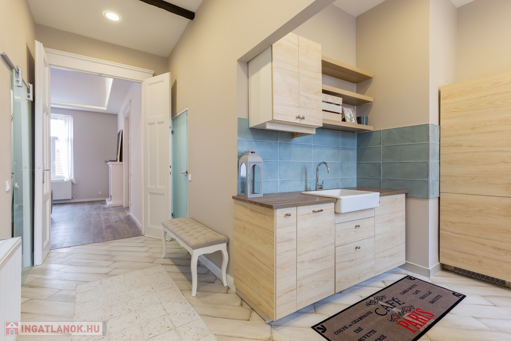 Jelenlegi kialakítás szerint, egy kis-szobányi gardrób áll rendelkezésre, vendégszobával, berendezett, igényes konyhával. A nagy ablakos fürdő szintén teljesen felújított, fa hatású csempével, és igényes zuhannyal van ellátva.