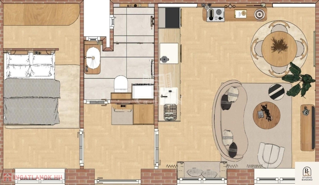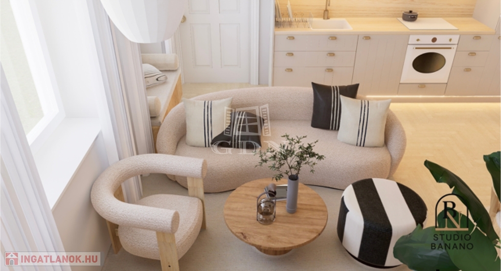 A 44m2-es lakás átalakítása során a beosztása fiatalos és tágas lett. A rendezett, kellemes társasház földszintjén található egy belső udvar. Innen belépve a lakásba, tágas előtérben találjuk magunkat, ahonnan balra a hálószóba nyílik, gardróbbal, szemben a fürdő és wc helyiség található, míg jobbra a tágas nappali vár minket.