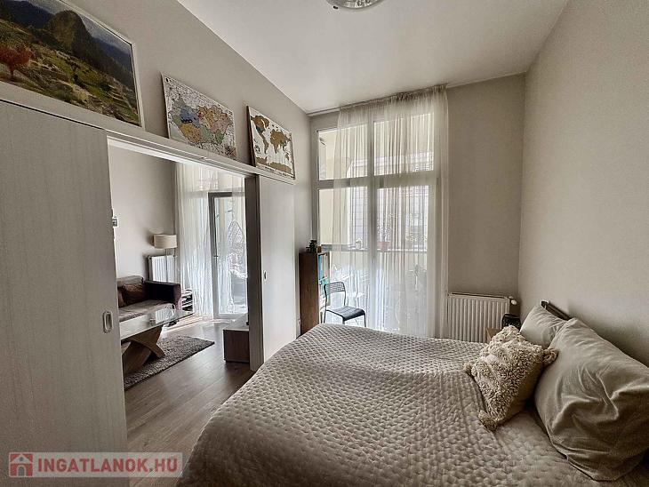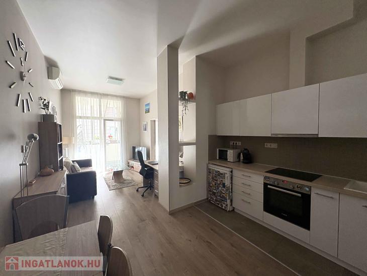 Az ingatlan praktikus elosztású: a konyha, az étkező és a nappali egy légtérben kapott helyet, ami tágas és modern életteret biztosít, emellett egy különálló hálószoba is rendelkezésre áll. A lakás utcai kilátásának köszönhetően kifejezetten világos és barátságos hangulatú. Tartozik hozzá egy erkély, amely kellemes helyszínt nyújt a reggeli kávézáshoz vagy esti pihenéshez, továbbá az 5. emeleten egy közös használatú terasz is a lakók rendelkezésére áll.