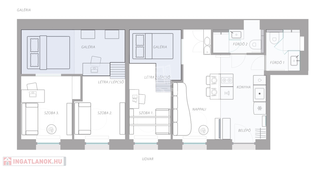 A 2017-ben teljeskörűen, lakberendező közreműködésével felújított, modern, 61 m²-es lakás amerikai konyhás nappalival rendelkezik, mellette három különnyíló, jól használható galériázott hálószoba található (11, 12 és 15 m²), továbbá két fürdőszoba (mindkettő WC-vel, mosdókagylóval és zuhanyzóval felszerelt, az egyikben mosó-szárítógép is van).