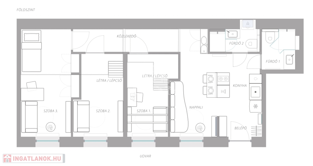A lakás ablakai a csendes belső udvarra néznek, ahol biciklik tárolása is biztonságosan megoldható. Az ingatlan teljesen gépesített és berendezett: beépített sütő, indukciós főzőlap, mosogatógép, hűtő fagyasztóval, nagy TV több száz csatornával, üvegszálas nagy sebességű internet.