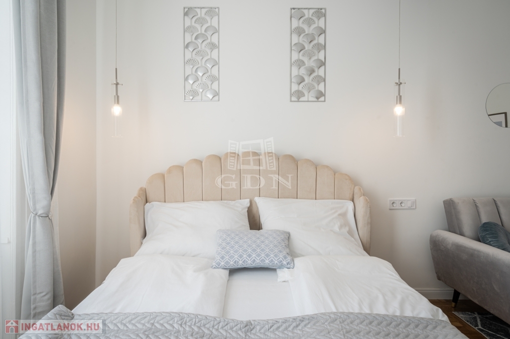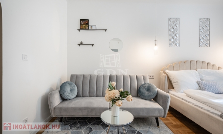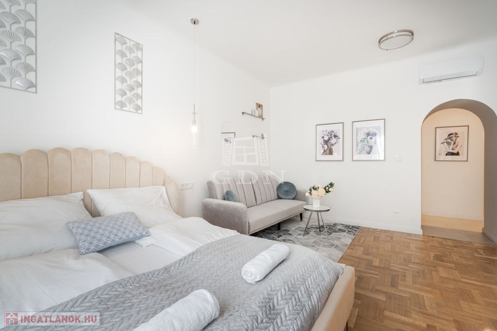 A nettó 64 m²-es lakás két különálló, önálló egységből áll, amelyek mindegyike saját fürdőszobával és konyharésszel rendelkezik. A felújítás néhány éve történt, a helyiségek klimatizáltak, a fűtést elektromos panelek biztosítják. Az ablakok a csendes belső udvarra néznek.