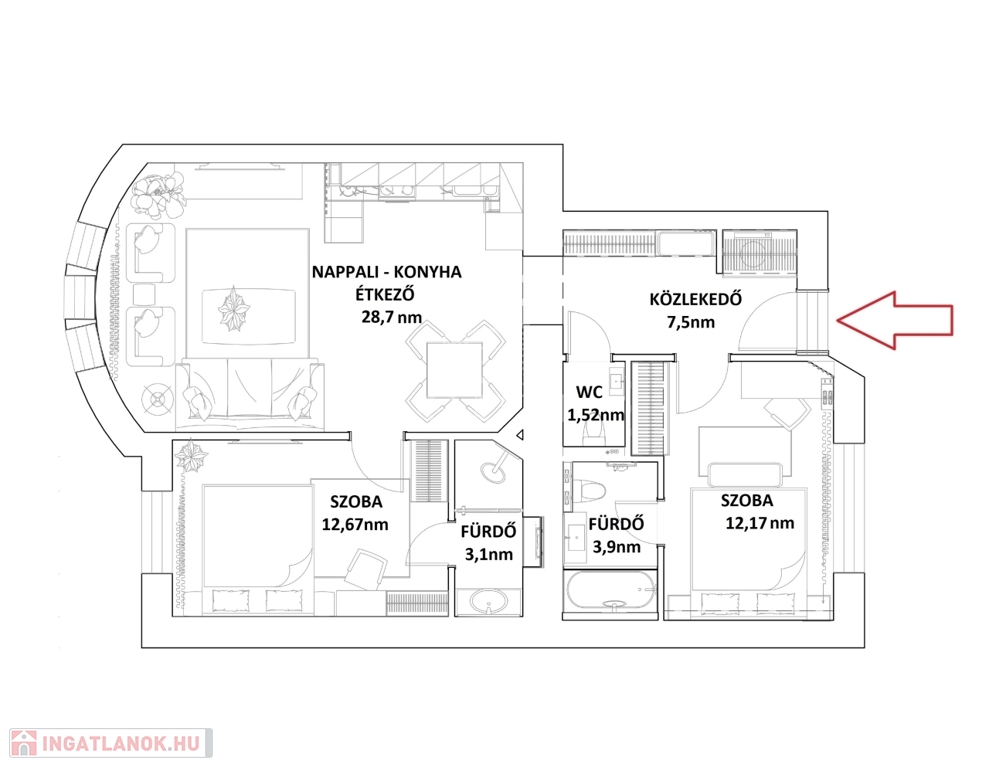 2 teljes értékű fürdőszoba (kádas + zuhanyzós) + külön WC
