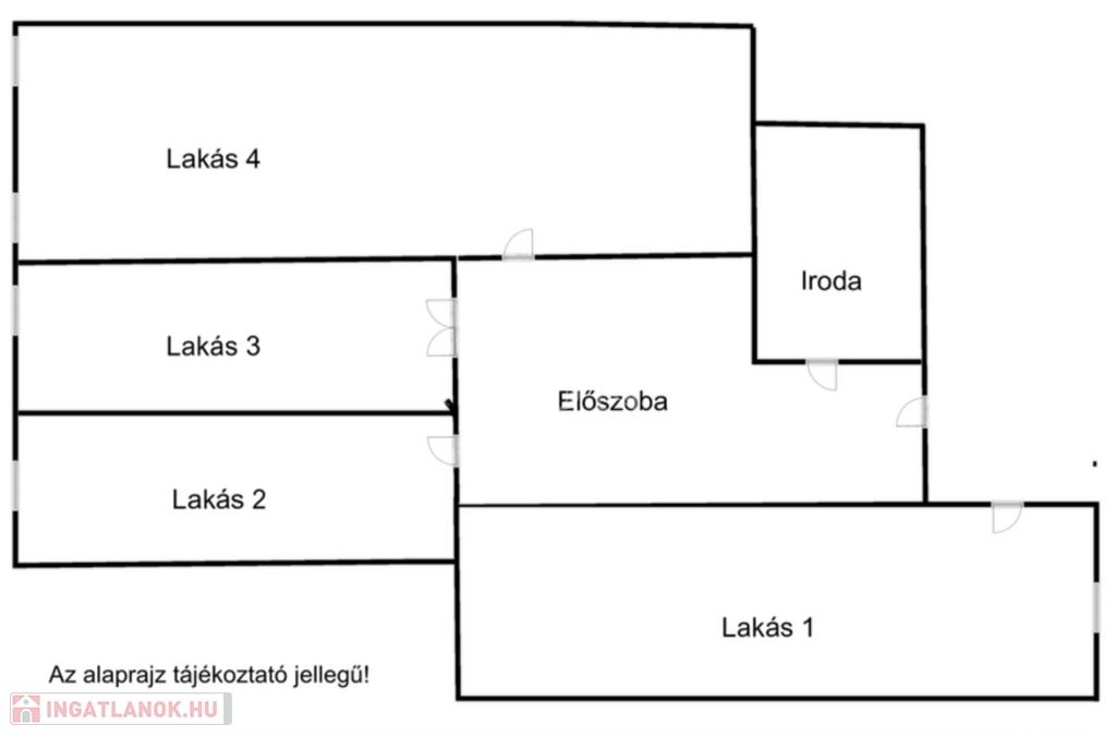 A négyből egy lakás külön bejárattal rendelkezik, a másik három egy közös folyosóról nyílik.