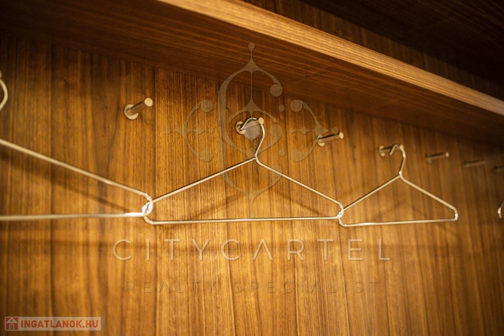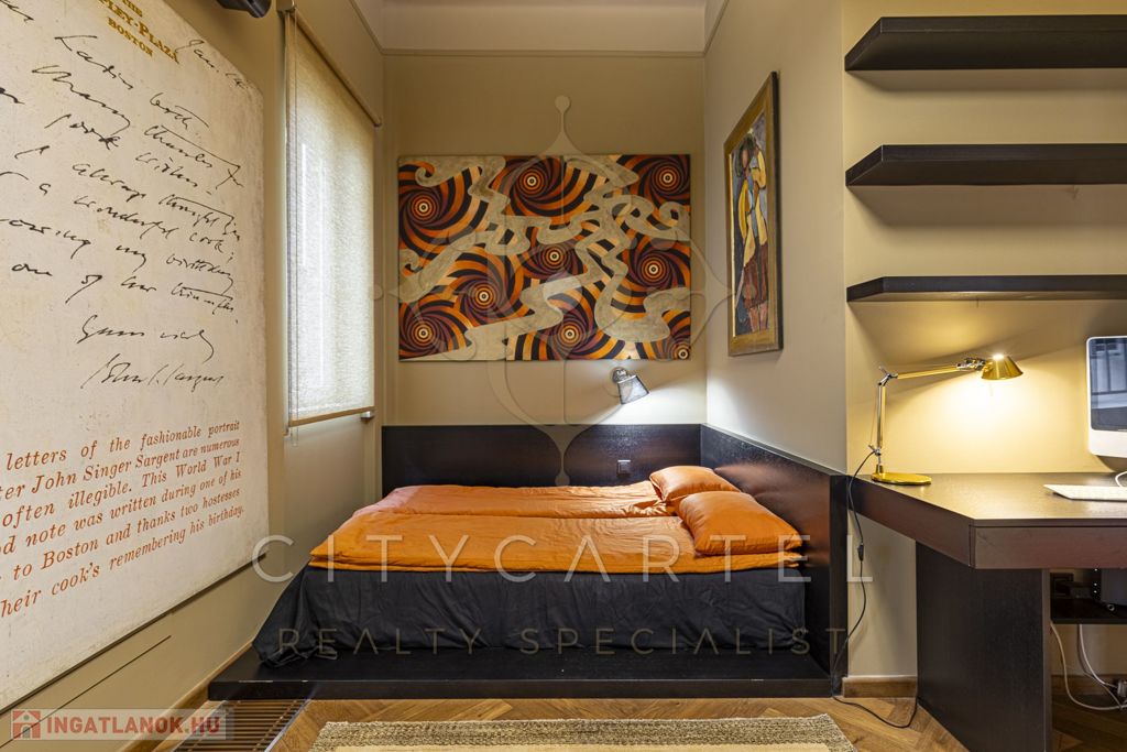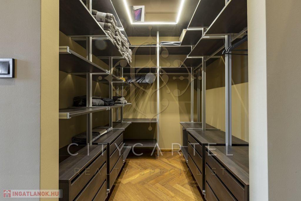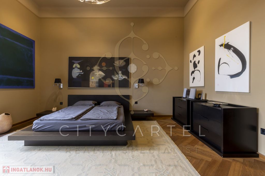 Az igényesen kialakított master bedroomban Alpi furnér típusú férfi íróasztal, női fésülködő asztal, bőr betétes- női-férfi komód, minimál futonágy található, de a kényelemhez önálló, egyedi igények figyelembevételével felszerelt, járható gardrób és exkluzív fürdőszoba is tartozik.