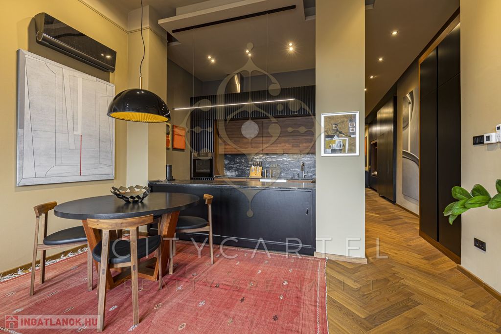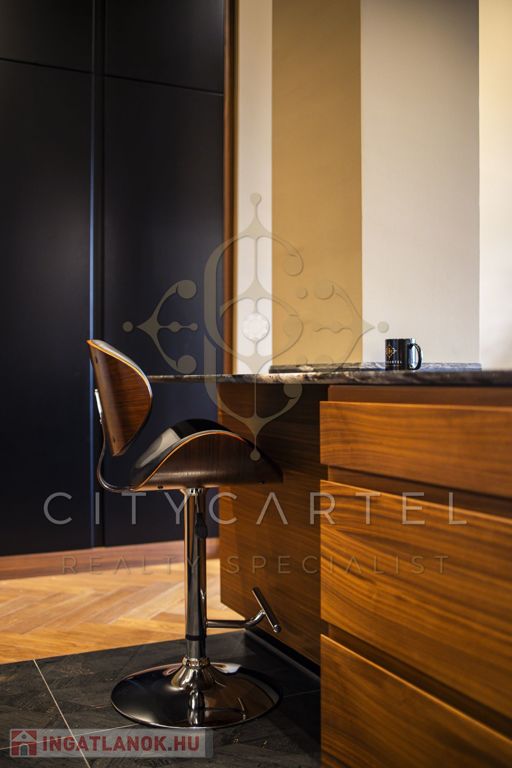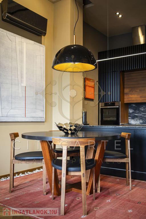 A felszerelt amerikai konyhás nappalit exkluzív, egyedi stílusban alkották meg a praktikusság és az esztétika szempontjait figyelembe véve.