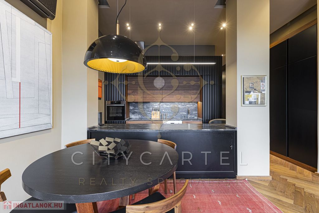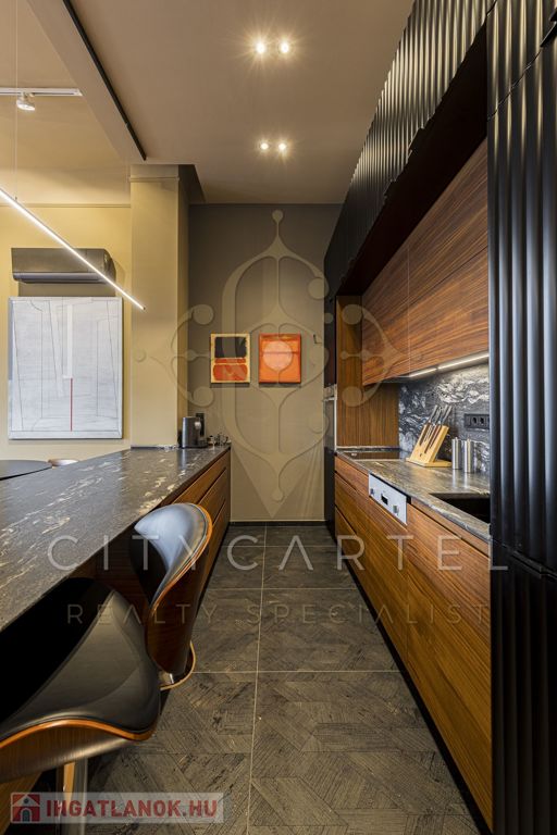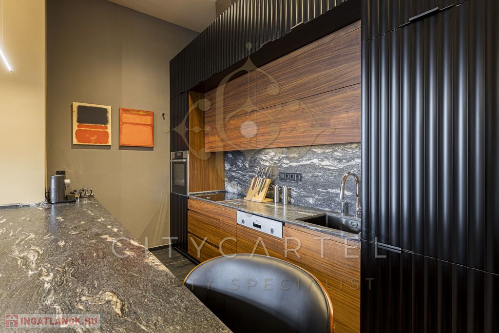 A speciális kezelésű gránit pult és az egyedi art deco borítású konyhabútor kialakítása mellett felső kategóriás konyhagépek (Gaggenau és Neff) kerültek beépítésre.
