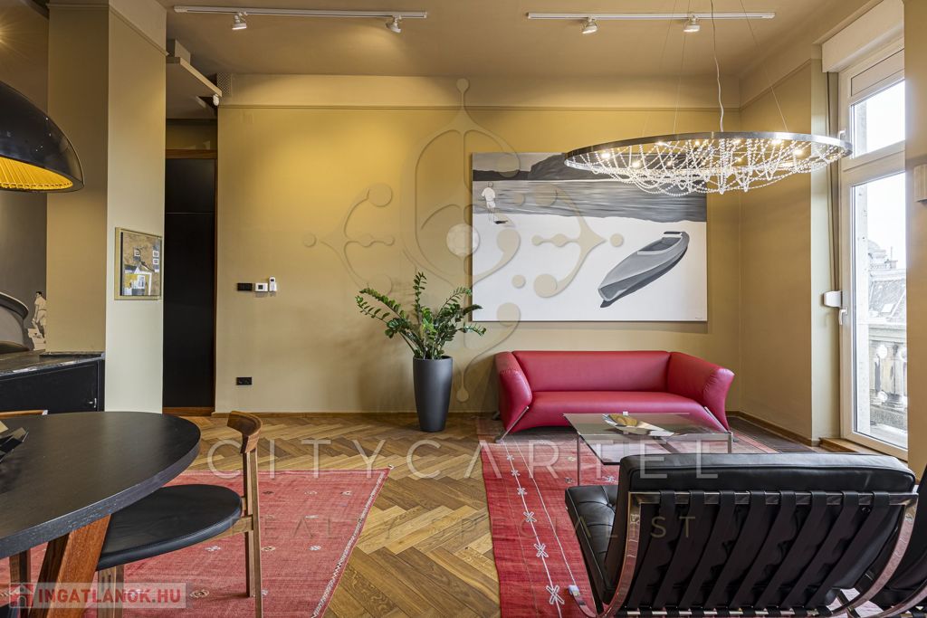 A tágas, fényárban úszó nappali egyedi design bútorokkal (Maxalto étkezőasztal, Rolf Benz kanapé, Barcelona fotel) lett berendezve, a reggeli kávénk elfogyasztása közben pedig az erkélyről szemlélhetjük a nyüzsgő belváros forgatagát.