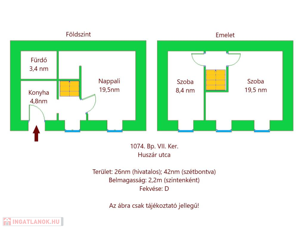 A 26 nm-es (bruttó 50 nm), jól kihasznált lakótérrel rendelkező ingatlan alsó szintjén található a nappali, beépített konyha, valamint egy zuhanyzós fürdőszoba WC-vel. Az emeleten két különnyíló hálószoba került kialakításra, amelyek csendes belső udvarra néznek.