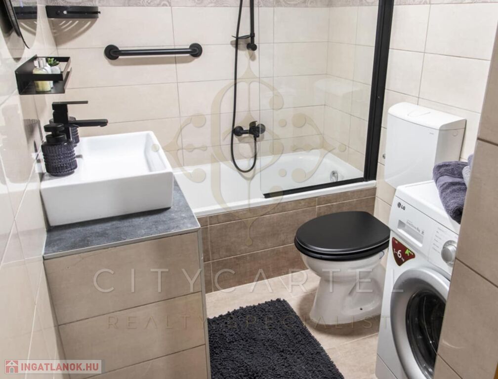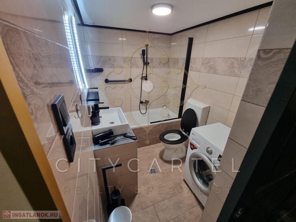 Fürdő és WC egy helyiségben, mosógéppel és törölközőszárítóval