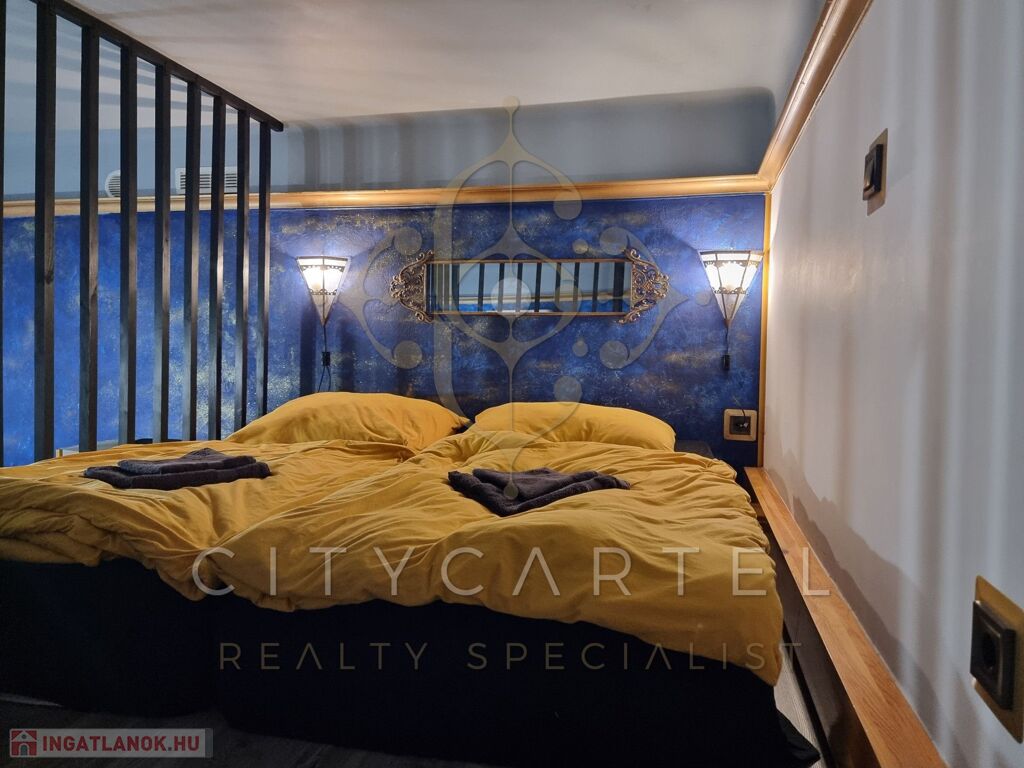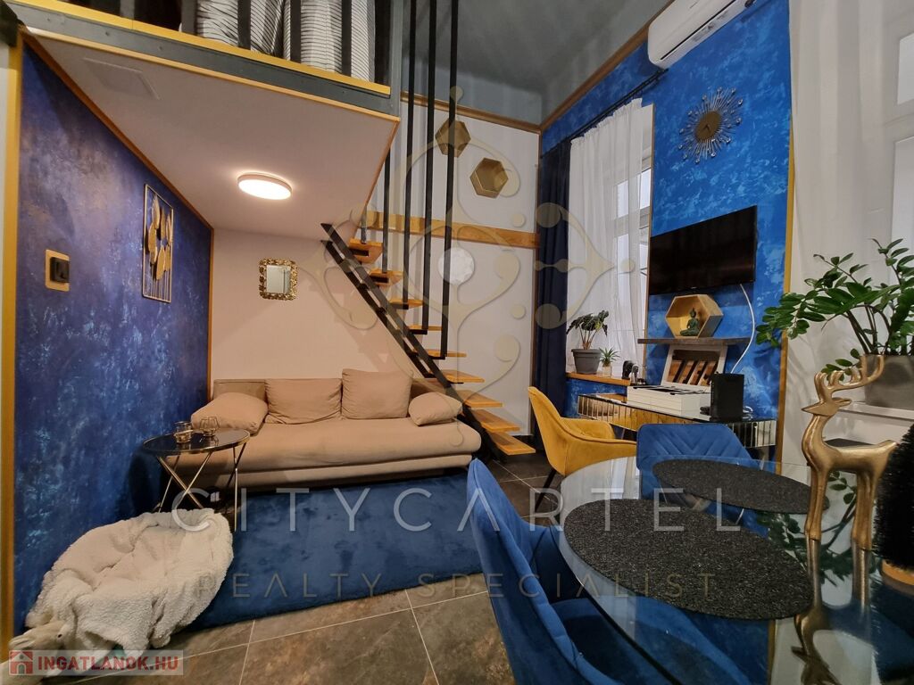 Ez a különleges, királykék, sárga és arany színvilággal megálmodott, ízlésesen felújított kis lakás azonnal rabul ejt. A nappali és a galéria harmóniája elegáns, mégis otthonos hangulatot teremt – igazi cosy városi ékszerdoboz.