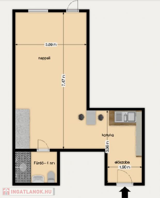 az egyik oldalon beépített szekrény, a másikon nappali/háló