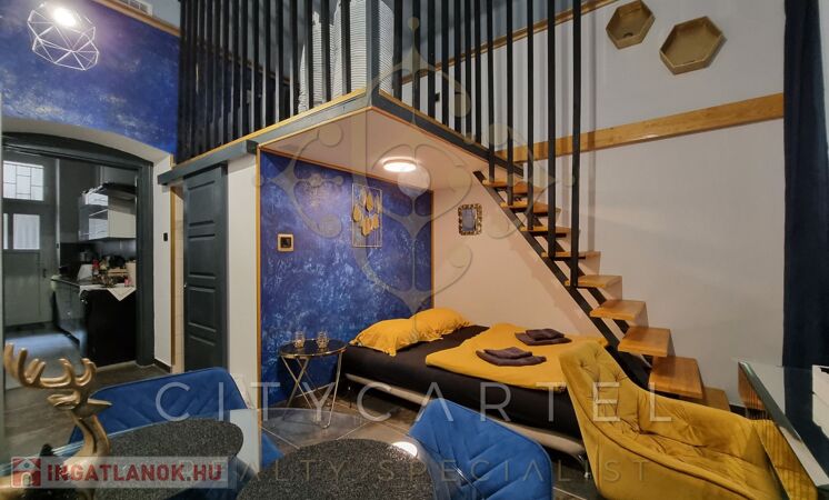 Ez a különleges, királykék, sárga és arany színvilággal megálmodott, ízlésesen felújított kis lakás azonnal rabul ejt. A nappali és a galéria harmóniája elegáns, mégis otthonos hangulatot teremt – igazi cosy városi ékszerdoboz.