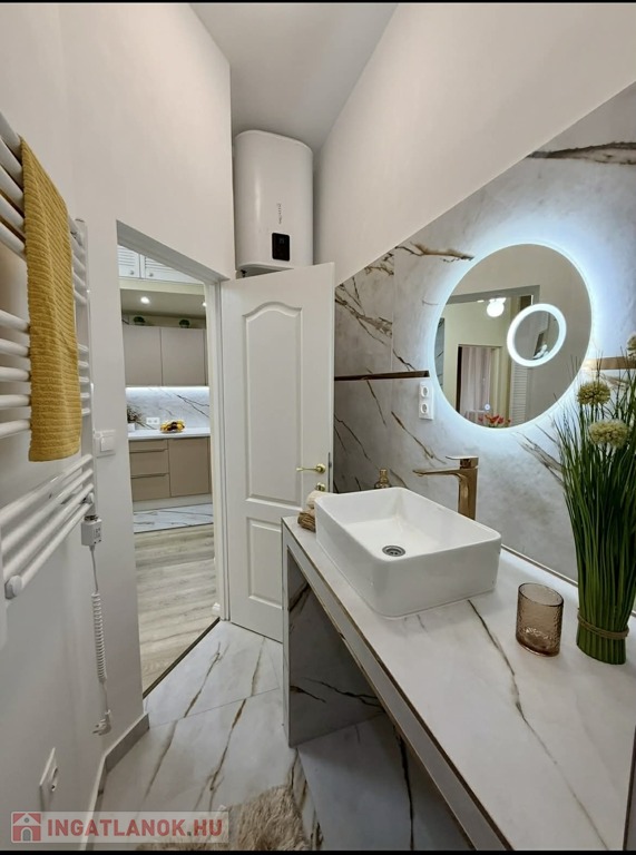 A felújítás mindenre kiterjedt: új burkolatok, új víz- és villanyvezetékek, aljzat födémig visszabontva és új betonréteggel kialakítva. Modern, fiatalos esztétika, minőségi konyhagépek – ide valóban csak költözni kell.