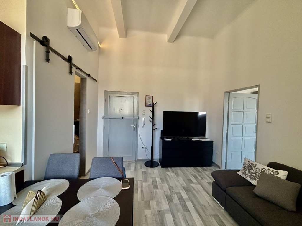 Az ingatlan egy jó állapotú, liftes ház legfelső emeletén helyezkedik el, 46 m2-es, amerikai konyhás nappaliból és egy tágas hálószobából áll. A lakás klímával felszerelt. Az ingatlan néhány évvel ezelőtt lett teljesen felújítva. A vételár a bútorokat és a berendezéseket is tartalmazza.