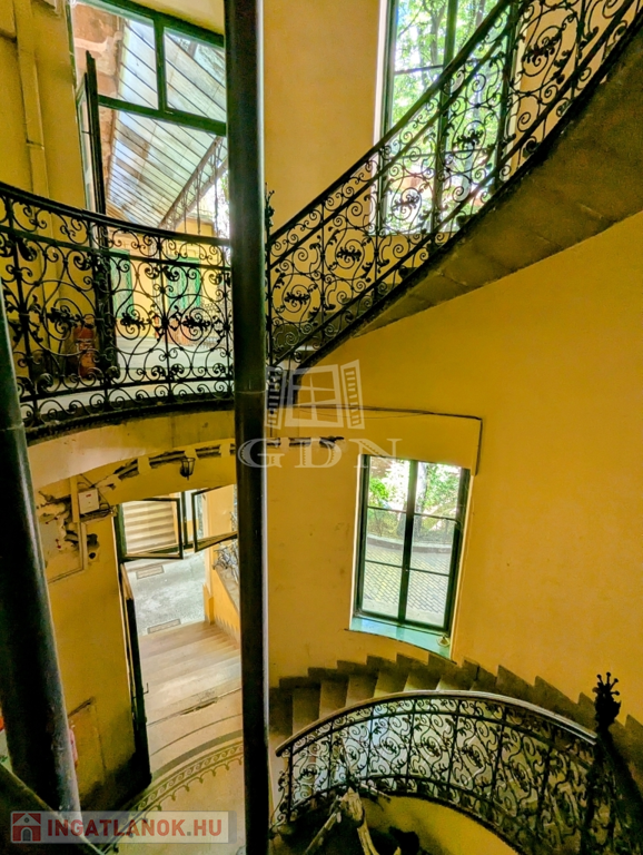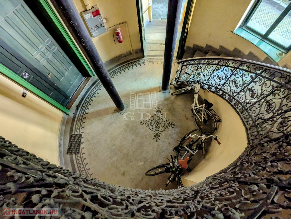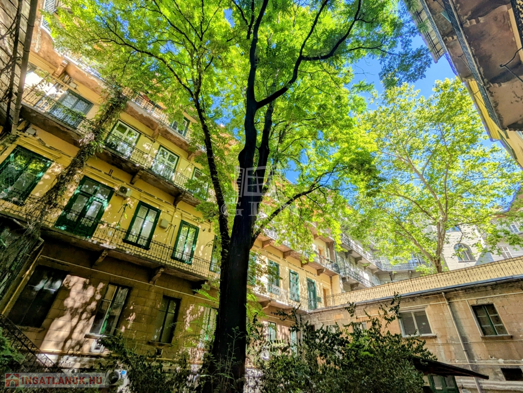 Az ingatlan egy 1880 körül épült, eklektikus-neoklasszicista társasház első emeletén található, vastag falakkal, hatalmas belmagassággal (4,6 méter!), és egyedi, köríves alaprajzi megoldással. A ház tágas, zöld belső udvara hangulatos, fákkal és bokrokkal övezett oázis a város szívében. A jelenlegi tulajdonosnak ritka lehetőségként saját kocsibeálló része is van az udvarban.