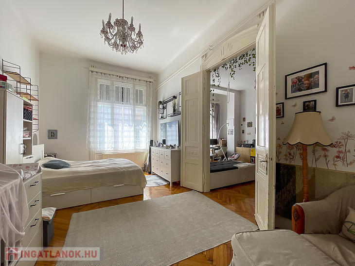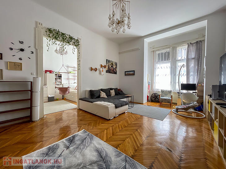 Palotanegyedben, liftes polgári társasház emeletén eladó egy kétgenerációs, tágas lakás.