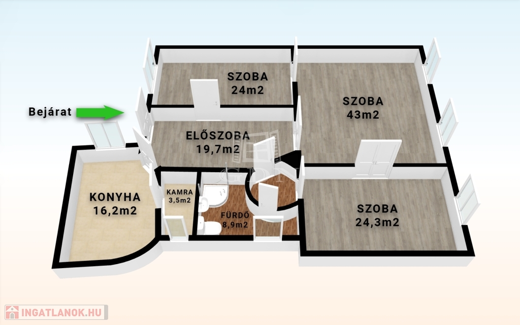 Szobák: 3 nagyméretű szoba