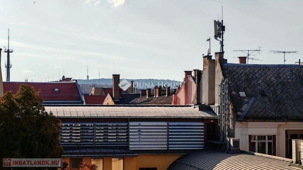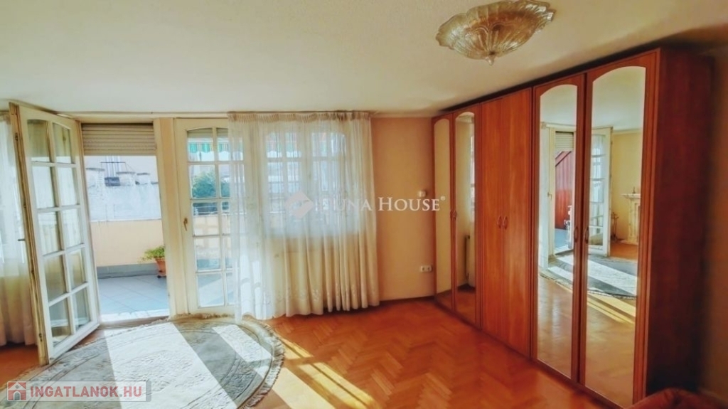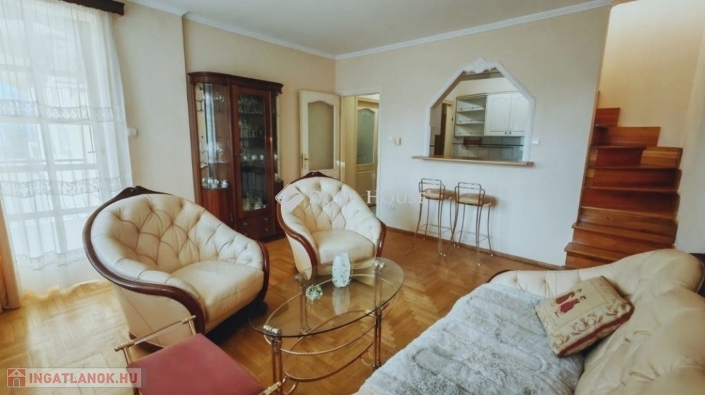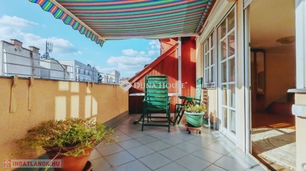 ELADÓ EGY DUPLEX, TETŐTERASZOS ÉS ERKÉLYES LAKÁS, GYÖNYÖRŰ, BELSŐ PARKKAL RENDELKEZŐ 2002-BEN ÉPÜLT TÁRSASHÁZBAN! Az ingatlan tulajdoni lapon 95 négyzetméteres. Két szintes. Az alsó szinten konyha, nappali, kamra, wc, fürdőszoba és egy kis háló található. A nappali erkélyes. A felső szinten egy tágas szoba kandallóval és egy nagy terasszal ad élményt a tulajdonosoknak. Minden nyílászáró műanyag és redőnyös! Az ingatlan szép napos és panorámás a kilátás! A fűtést és meleg vizet cirkó kazán biztosítja. Mind a kettő szint klimatizált! A lakás a teljes bútorzattal együtt eladó! A társasház egy különleges épület az utcában. Belső kertje, parkja van szökőkúttal. Lakóközösség nagyon jó! Az épületnek van saját garázsszintje, de sajnos ehhez a lakáshoz már nincs meg a garázs. Parkolási lehetőség az utcán megoldható. Kérem keressen bizalommal bárminemű kérdése van az ingatlannal kapcsolatban.