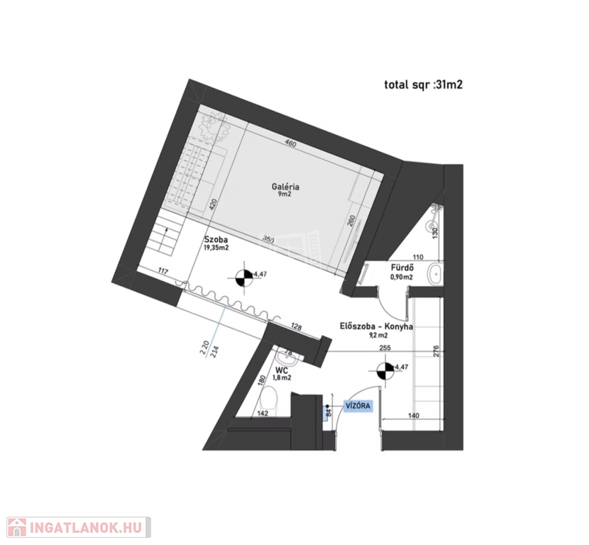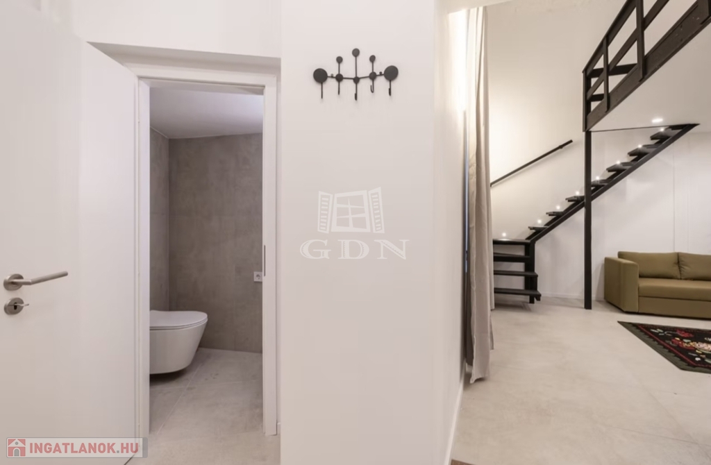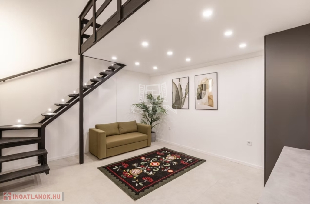 A lakás tényleges alapterülete 31 m², míg a tulajdoni lapon 27 m² szerepel. A több mint 4 méteres belmagasságnak köszönhetően teljes értékű galéria került kialakításra, amely külön hálórészként funkcionál. A galériával együtt a lakás teljes használható alapterülete 40 m².
