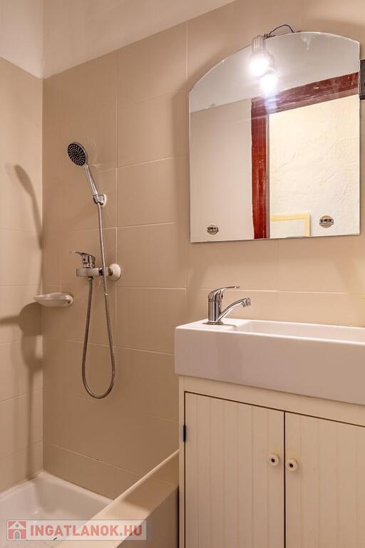 A fürdőszoba zuhanyzós, a konyha praktikus elrendezésű, étkezős méretű.