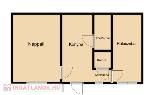 A lakás a harmadik emeleten egy körfolyosóról nyílik. A tágas konyhába érkezünk amiben egy étkező sarok is elfér. Balra a tágas nappali szoba aminek ablaka a nyitott körfolyosóra néz ez által kellően világos. A gépesített étkezősarkos konyhából nyílik a kádas fürdőszoba amiben a toalett is helyet kapott. Jobbra a közlekedőből nyílik egy kamra ami biztosítja a tárolási lehetőséget. Szemben a hálószoba aminek az ablaka szintén a folyosóra néz.