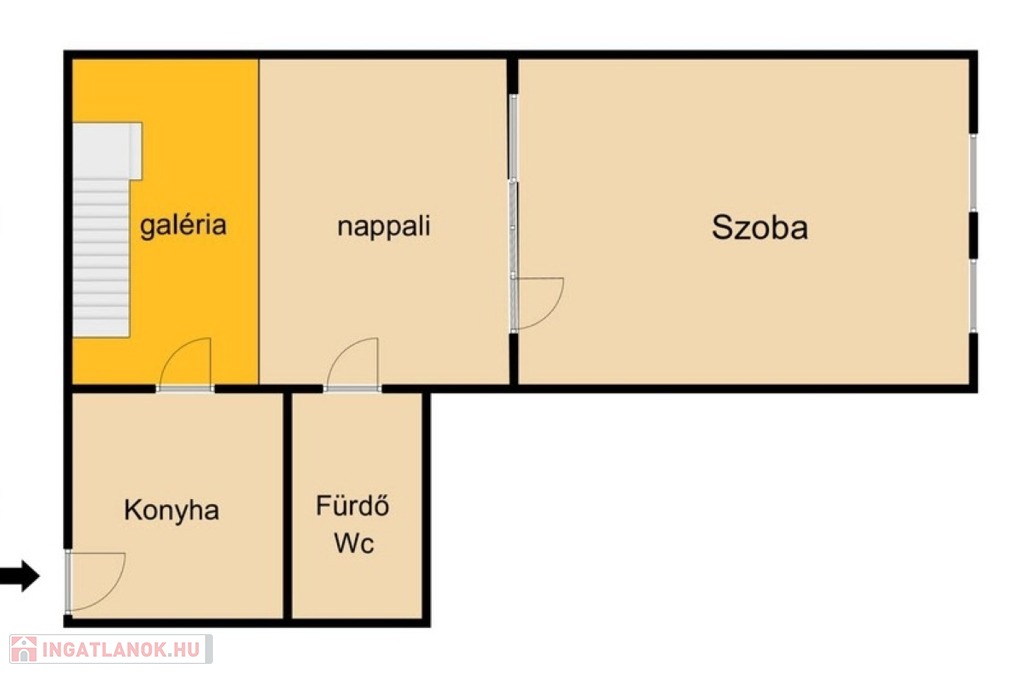 A konyhából jobbra nyílik a nappali, világos, tágas tér, fölötte a 10,5nm -es galéria, amely hálóként vagy dolgozósarokként is kiválóan használható.