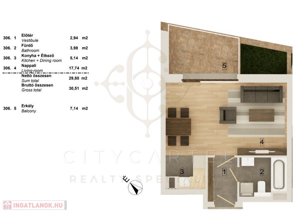 A liftes társasház 3. emeletén található, 30,51 nm-es, (29,8 nm lakás 7,14 nm terasszal) 1 szobás lakás korszerű hőszivattyús fűtés–hűtéssel és teljes körű okosotthon-rendszerrel felszerelve várja új tulajdonosát. A burkolatok még választhatók, így a leendő tulajdonos saját ízlésére szabhatja az ingatlant.