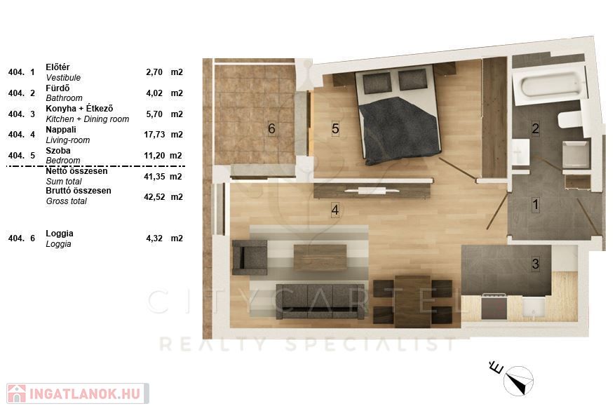 A liftes társasház 4. emeletén található, 43,55 nm-es, (41,36 nm lakás 4,37 nm loggiával) 2 szobás lakás korszerű hőszivattyús fűtés–hűtéssel és teljes körű okosotthon-rendszerrel felszerelve várja új tulajdonosát. A burkolatok még választhatók, így a leendő tulajdonos saját ízlésére szabhatja az ingatlant.
