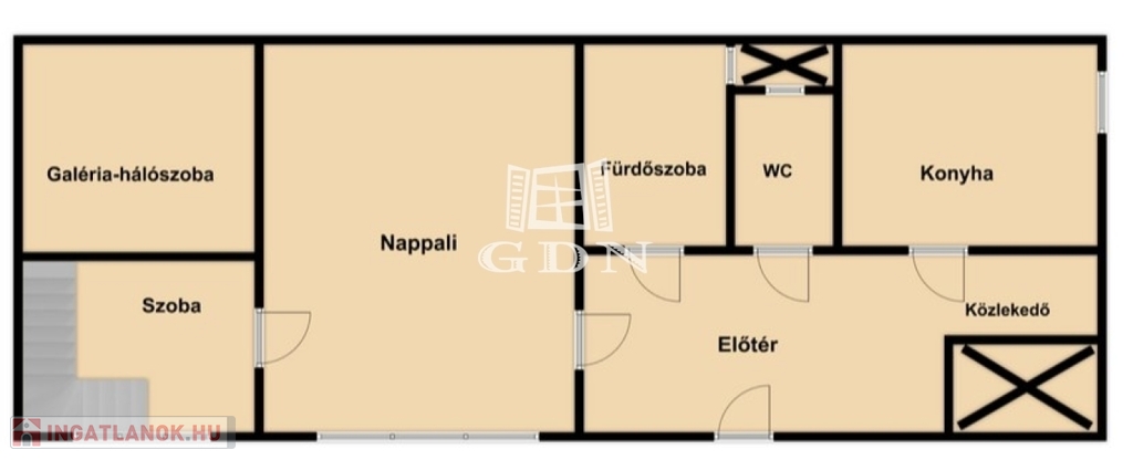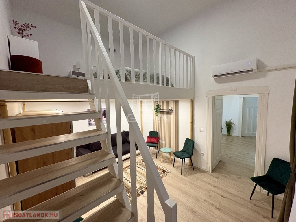 Az ingatlan a tulajdoni lap szerint 63 m², azonban a nagy belmagasságnak köszönhetően kialakított, teljes értékű állógalériával a hasznos alapterület meghaladja a 75 m²-t.