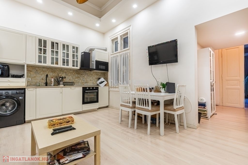 Egyedi ajánlat!! 1 millió Ft/ nm ár!! Használja ki most a 3 %-os lakáshitelt!!Megvételre kínálom ezt a 77 nm alapterületű, 2 szobás - a Rákóczi úttól kb 50 méterre található, az Erzsébet körúthoz közeli - 2019-ben teljeskörűen felújított 2. emeleti lakást.Az ingatlanba belépve szemben találjuk a gépesített konyhát (mosógép, hűtő, elektromos sütő, főzőlap), a folyosóról jobbra található egy különnyíló, galériázott( masszív vasgerenda, faburkolat) szoba (közel 14 nm), amely a csendes udvarra néz. Tovább haladva balra található a fürdő, amely zuhanyzóval van ellátva, majd tovább haladva a világos, csendes, nagyméretű ( 33nm) nappaliba érünk.Az ingatlan per és tehermentes, 1/1 tulajdon, rövid időn belül költözhető.Az ingatlan fűtűs/hűtéséről 3 db inverteres klíma gondoskodik.Közös költség 16.000.- Ft.A házat folyamatosan karbantartják, a lépcsőházat nemrégiben festették ki.Tömegközlekedés szempontjából is kiváló, a 4-es és a 2-es metró kb 2 percre található, a 7-es,99-es busz valamint a 4-es és 6-os villamos szintén pár perc sétatávolságra van.Az utcán mindig található parkolóhely.Megtekintéssel vagy egyéb kérdéssel kapcsolatban állok rendelkezésére a hét bármely napján.A hirdetésben szereplő FIX 3%-os lakáshitel részét képező támogatásokat Magyarország Kormánya nyújtja.