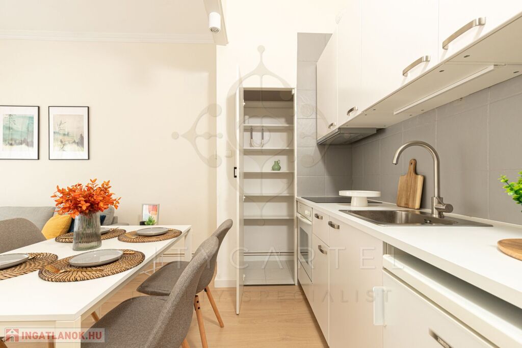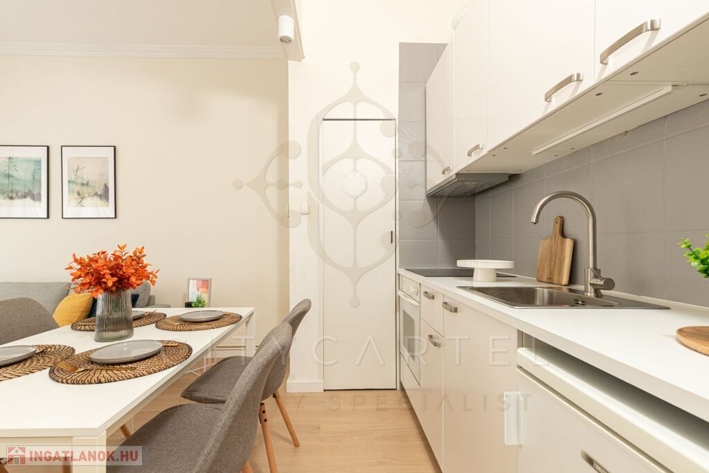 A világos, amerikai konyhás nappali természetes találkozópont – nappal élettér, este megérkezés. A lakás klimatizált, gépesített, és igény szerint bútorokkal együtt is megvásárolható, így akár befektetésnek, akár saját célra azonnal használatba vehető.