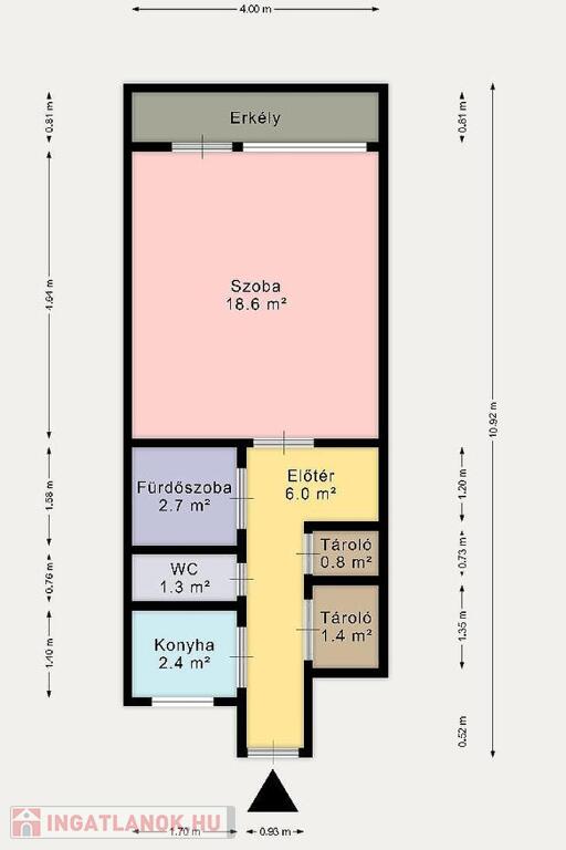 Elosztása kiváló, a fürdő és a mellékhelyiség külön helyezkedik el, ablakos konyhája van, és a szobából nyílik egy 8nm-es erkély.