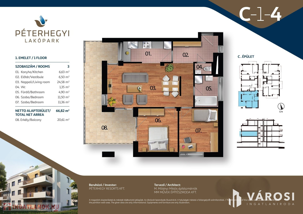 Alapterülete 66,82 m2 + 20,61 m2 terasz.